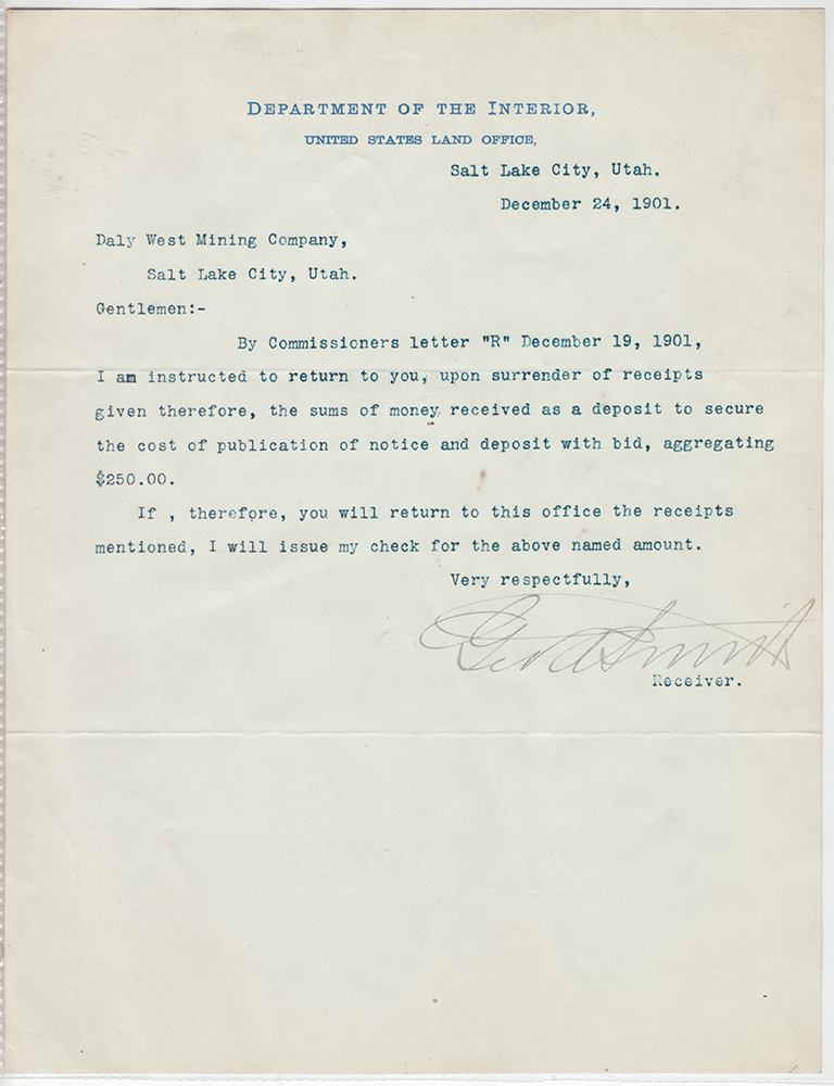 Letter of George Albert Smith, Salt Lake City, Utah, December 24, 1901, to Daly West Mining Company, Salt Lake City, Utah. Signed George Albert Smith. Size: 8 X 10 inches.